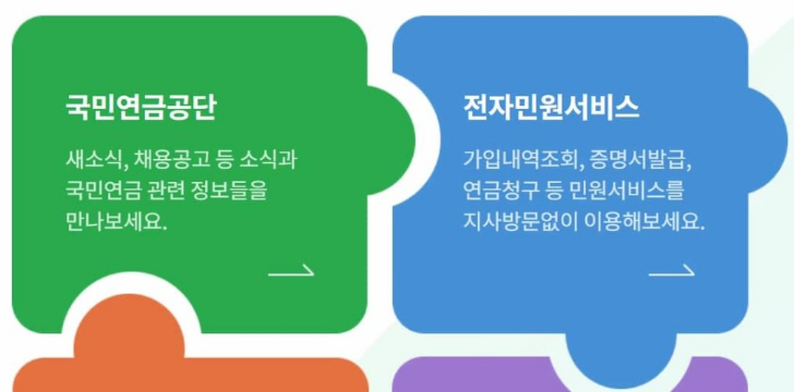 국민연금 관리공단 홈페이지에서는 국민연금과 관련된 민원을 처리하며, 가입 내역등을 간편하게 확인할 수 있습니다.