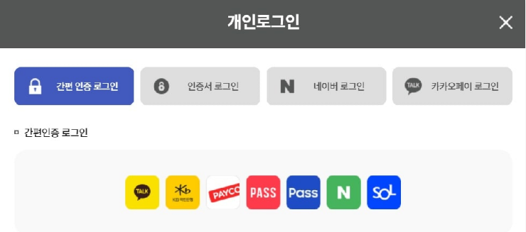 3. 개인인증 로그인(공동인증서 혹은 네이버, 카카오, 패스앱 간편 인증)