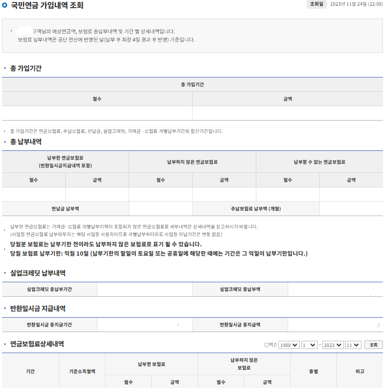국민연금 가입내역 조회에서는 총 가입기간, 총 납부내역, 실업크레디트 납부내역, 반환일시금 지급내역, 국민연금 보험료 상세내역을 확인할 수 있습니다.