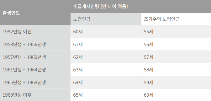 ●일반 국민연금 수령 나이는 다음과 같은 나이 조건을 충족해야 합니다. 또한 소득이 없을 시에 국민연금 노령연금액의 100%를 받을 수 있습니다.