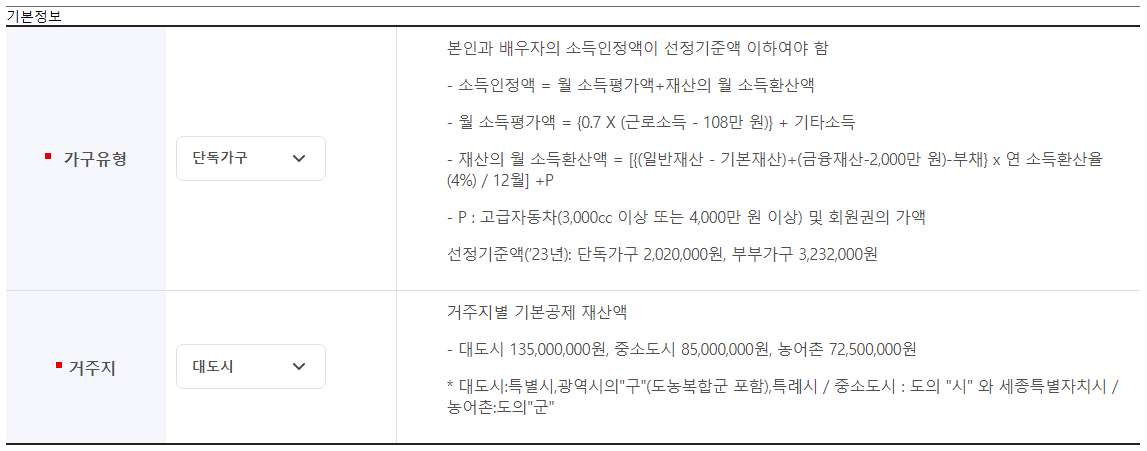 선정기준액(’ 23년) : 단독가구 2,020,000원, 부부가구 3,232,000원