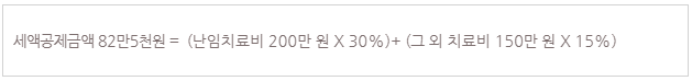 총 350만 원에서 난임치료비 200만 원에 30%와 나머지 지출에 해당하는 150만 원의 15%를 더해주면 82만 5천 원이 나옵니다.