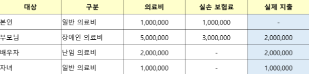 여기서 주의하셔야 할 점은 실손보험비를 제외한 의료비용만 공제 대상이 됩니다.