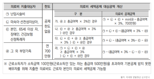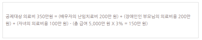 - 유의하셔야 하는 점은 배우자를 제외한 부양가족의 경우 인적공제를 받는 사람이 의료비 공제 대상이 된다는 점입니다. 예를 들어 65세 이상의 시어머니의 인적공제는 남편이 받고 의료비는 내가 공제받는 것은 불가능합니다.