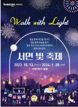 부산 대표 도심관광지인 서면의 대표 관광축제인 [서면 빛 축제]입니다. 역동적인 서면에 어울리는 다채로운 테마 연출로 차별화된 볼거리를 제공합니다. 형형색색 빛 조형물 및 포토존 조성되어 있으며, 미디어파사드 연출, 소원리본 등 시민참여 프로그램을 운영합니다.