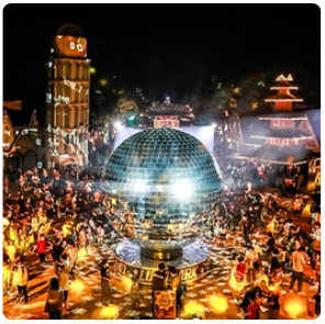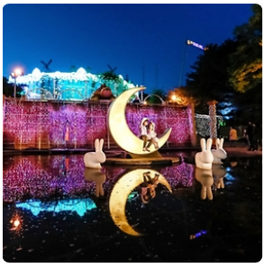 [서울랜드 빛축제 루나파크]는 서울에서 가장 가까운 빛 축제로, 매일 밤 서울랜드의 28만 2250㎡의 넓은 공간 전체가 거대한 빛의 공연장으로 새롭게 변신해 환상적인 분위기의 라이트닝 공연이 펼쳐집니다. 서울랜드의 상징 '지구별'에서는 3D맵핑과 음악이 어우러진 공연이 펼쳐집니다. 특히 6m 크기의 국내 최대규모 미러볼이 등장해 빛축제의 하이라이트를 선보입니다. 루나레이크에서는 LED일루미네이션이 화려한 빛으로 관람객들의 시선을 사로잡습니다. 또한 로맨틱가든에서는 웨딩을 테마로 한 가제보와 대형 LED 장미꽃이 형형색색 빛으로 낭만적인 분위기를 더합니다. 여기에 공원 곳곳 위치한 보름달 실루엣, 초승달 등 다양한 포토존은 관람객들이 인생샷을 남기기에 충분합니다.