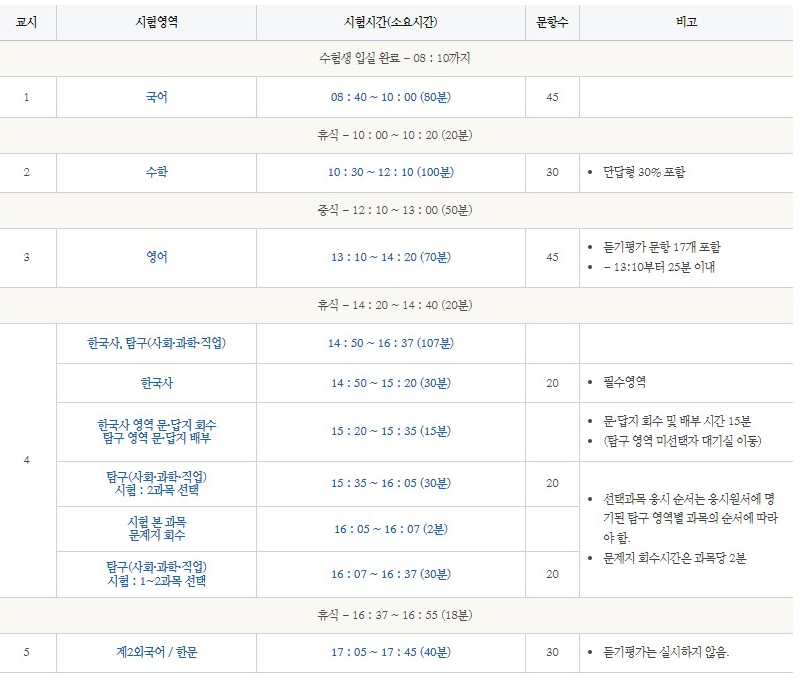 - 4교시는 한국사 영역 시험 이후, 탐구 영역 시험이 진행됨. 한국사 영역 시험시간은 30분이며, 한국사 영역 종료 후 15분의 문답지 회수 및 탐구 영역 미선택자 대기실 이동 시간을 둠.