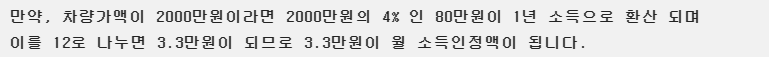 차량가액의 4% 를 12개월로 나누어 월 소득으로 환산하게 됩니다.