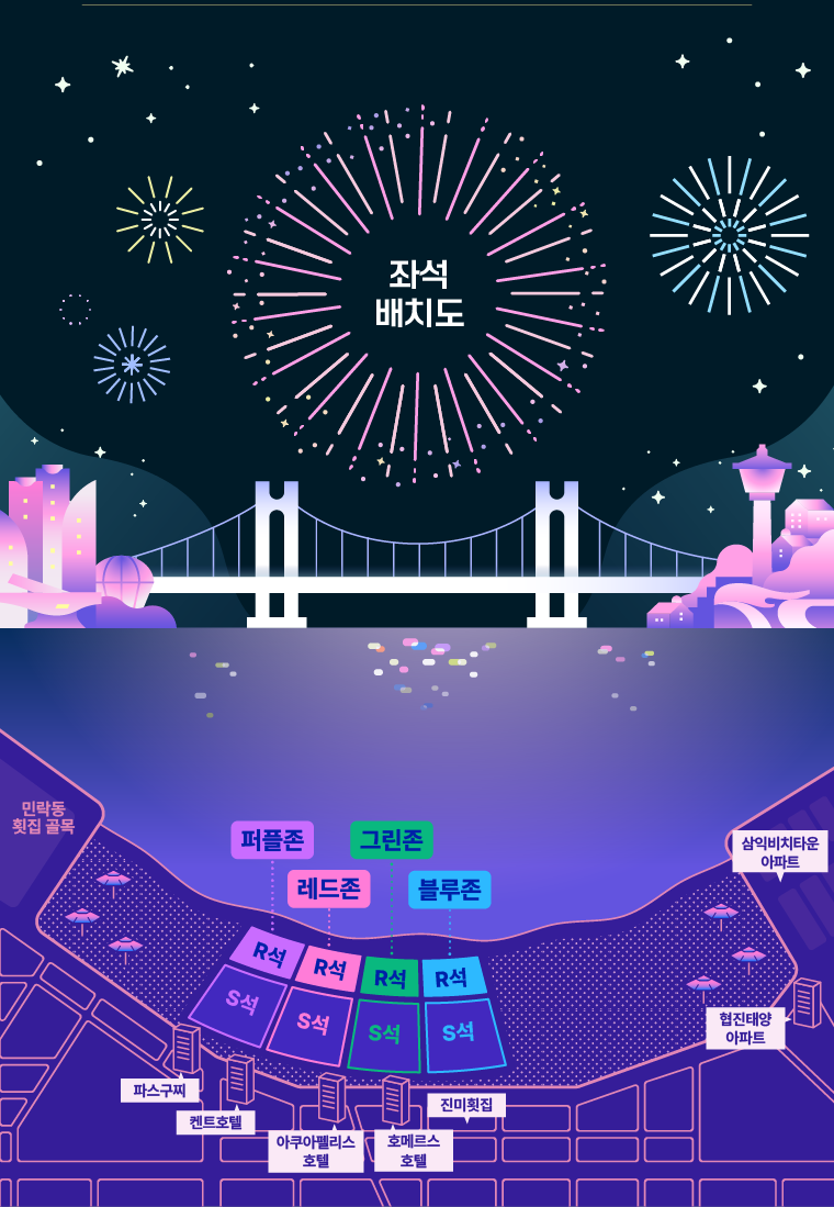 불꽃놀이를 제대로 즐기기 위해서는 좋은 자리를 선점하는 것이 중요합니다. 광안리 해수욕장 주변에는 다양한 관람 구역이 마련되어 있으며, 퍼플존, 그린존, 레드존, 블루존 등으로 나뉘어 있습니다. 특히, 해변가에 가까운 자리는 인기가 많으니 미리 자리를 잡는 것이 좋습니다.