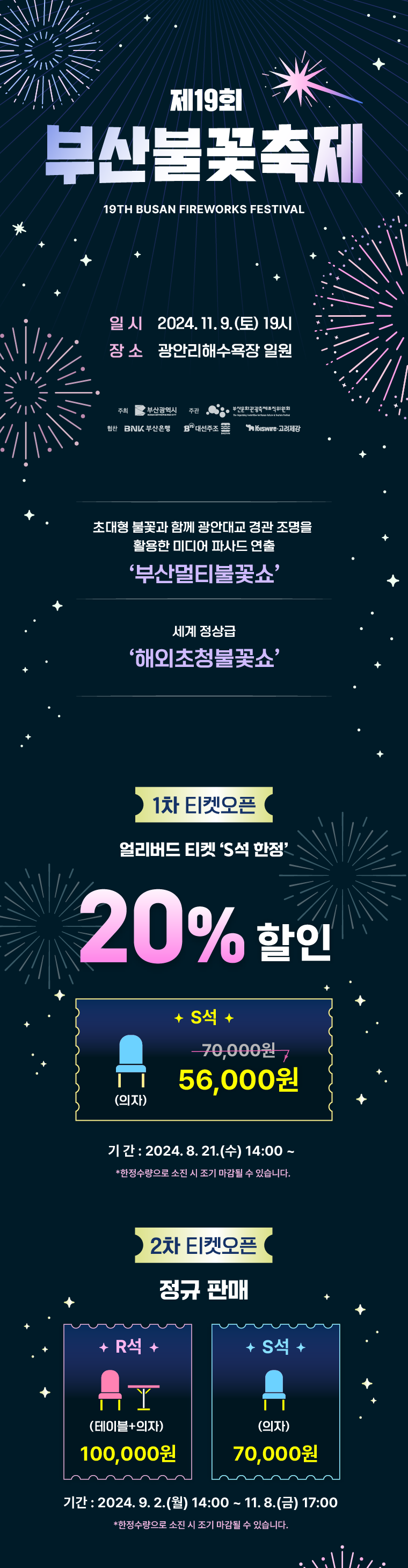 티켓은 2024년 8월 21일부터 판매가 시작되며, S석은 20% 할인된 가격인 56,000원에 구매할 수 있습니다. 일반 판매는 9월 2일부터 11월 8일까지 진행되며, 티켓 구매는 예스24와 같은 온라인 플랫폼을 통해 가능합니다. 관람 등급은 제한이 없으며, 총 60분간의 불꽃놀이가 펼쳐질 예정입니다.
