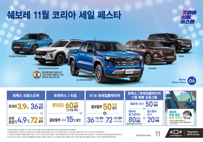 한국지엠은 이번 코리아 세일 페스타에서 다양한 모델에 대한 할인 혜택을 제공합니다. 특히, 트레일블레이저, 타호, 콜로라도 등 인기 모델에 대한 특별 할인이 눈에 띕니다. 한국지엠은 소비자들에게 매력적인 가격으로 차량을 제공하며, 다양한 프로모션을 통해 고객들의 관심을 끌고 있습니다.